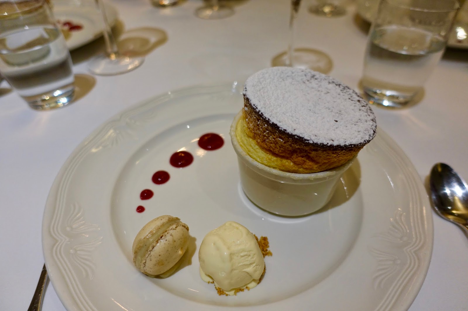 To end the fulminant meal, all of us (we dined with friends) had preordered a soufflé. These are available in following flavors: Grand Marnier, vanilla, cream cheese and chocolate and are served with lemon vanilla ice cream. I opted for cream cheese and was delighted by the palatable dessert.